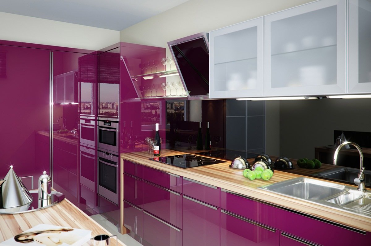 Очень яркий оттенок на грани между темно-розовым и лиловым в пространстве кухни создает жизнерадостную атмосферу, побуждая к творчеству и фантазии.