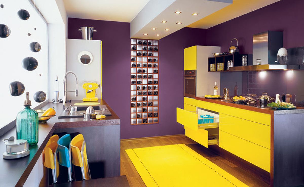 Фиолетовый в кухне желательно применять дозировано, «разбавляя» его дополнительными оттенками. Лучшими цветами-«компаньонами» считаются: