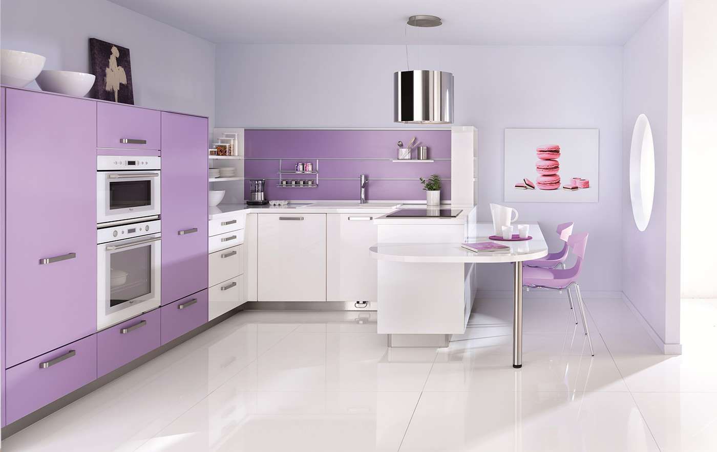- Для создания контрастного фона ярко-фиолетовому гарнитуру выберитебелый цвет для стен, пола и потолка. Поддержите активный цвет мебели, добавив фартук и столовую группу с вкраплениями того же оттенка.