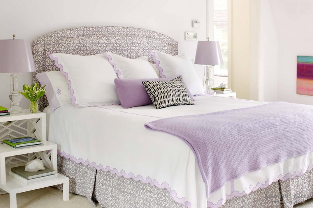 Белый цвет – фаворит спальных интерьеров. Белые портьеры прекрасно подходят к бледно-сиреневым обоям. Удачно сочетание «белый-сиреневый» и для кухни. Нейтральными оттенками, помимо белого, могут быть серый, серебристый, светло-голубой. Они призваны уравновесить фиолетовый, сделать интерьер более спокойным и гармоничным.