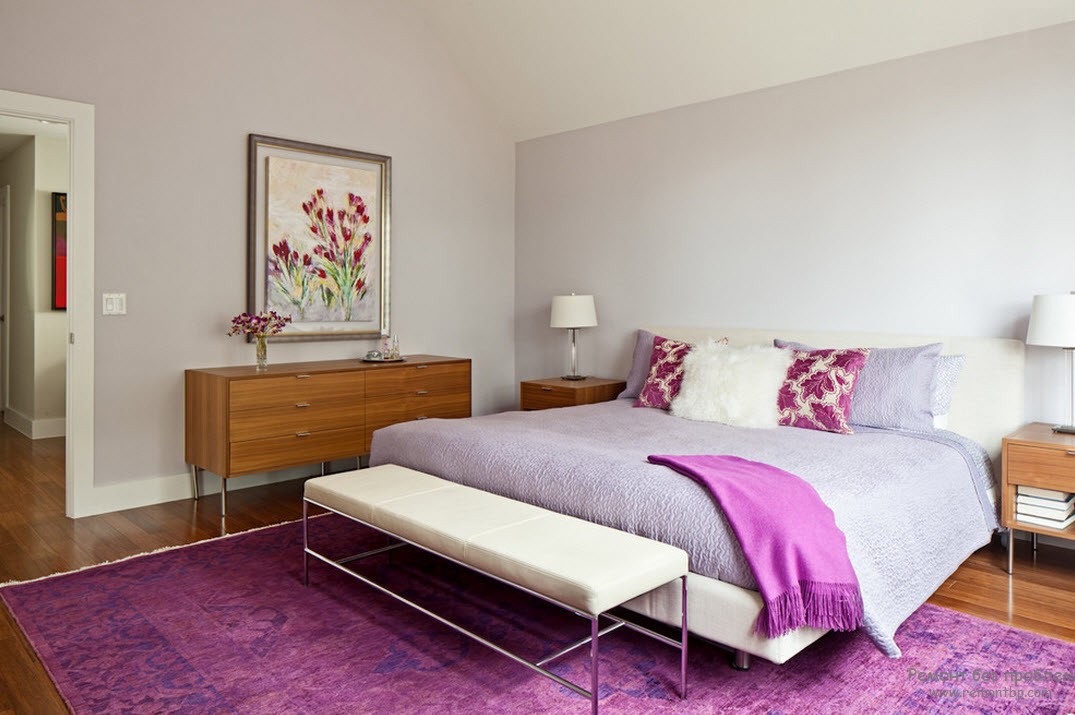 В этом интерьере использовался орхидеевый оттенок. Стены выкрашены очень бледной краской, поэтому комната не кажется перегруженной фиолетовым цветом. Тюль используется однотонная, похожий оттенок есть у изголовья кровати. Главный штрих такого интерьера – ковёр. Он имеет сложный геометрический рисунок, при этом сочетает в себе сразу несколько оттенков фиолетового. Это сочетание связывает и стены, и изголовье, и шторы в единое целое. Интерьер выглядит продуманным и завершённым.