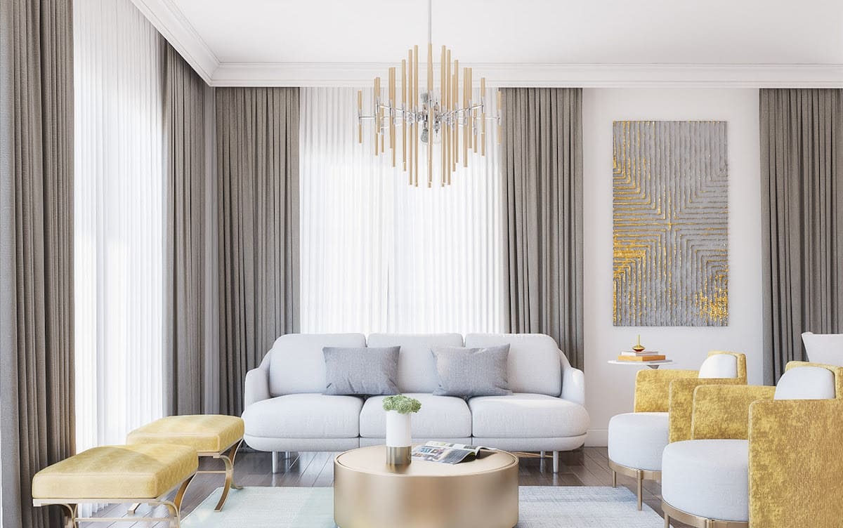 Даже при наличии желтого света, который дарят светильники, гостиная в серых тонах кажется скучноватой. И хотя соответствующее понимание приходит со временем, его необходимо заранее предупреждать, используя: