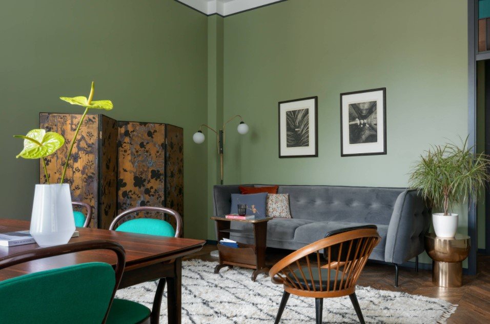А такие одновременно строгие, богатые и насыщенные тона, как хвоя, тёмная бирюза или изумруд, станут идеальным решением для создания интерьера в гостиных большого размера.