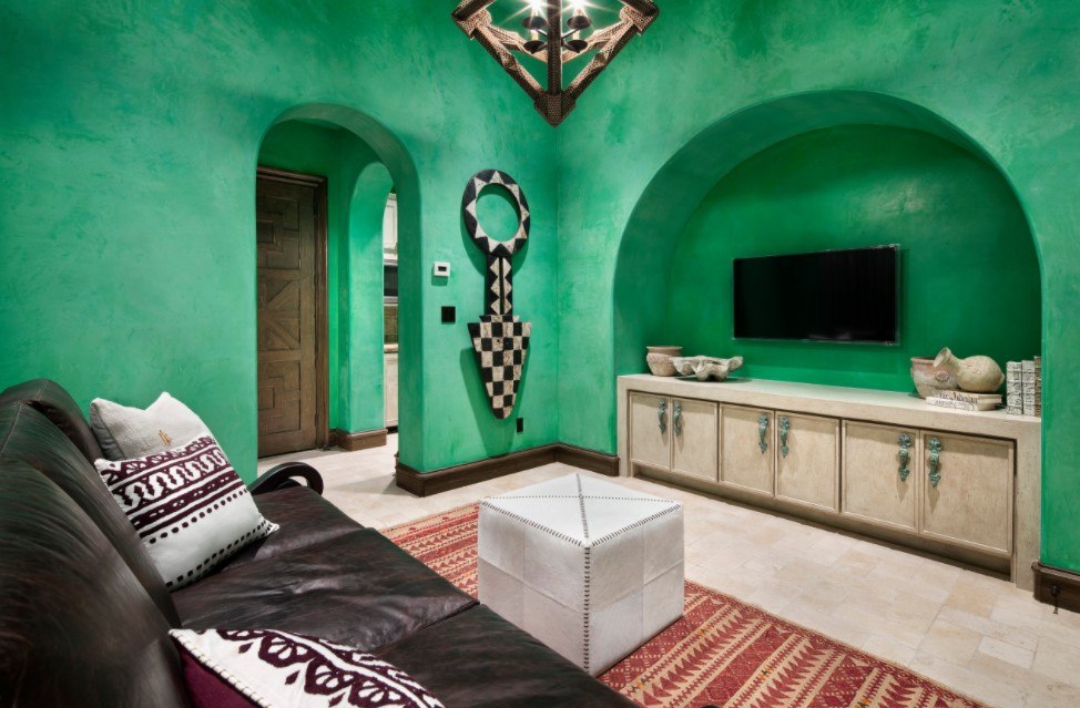 Авантюрные нотки придутся по вкусу любителям востока. В такой спальне можно обыграть переливы двух драгоценных камней: изумруда и александрита