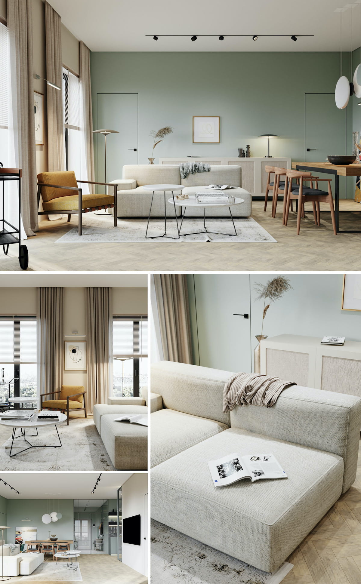 От гостиной с оливковыми или шалфейными нотками будет исходить тепло.
