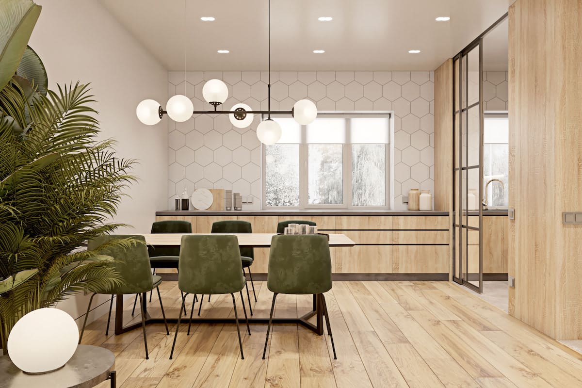 Зрительно расширить пространство помогут светло-зеленые потолки и не тяжелые карнизы. Пол можно застелить паркетом малахитового оттенка или использовать коричнево-зеленый ламинат, плитку.