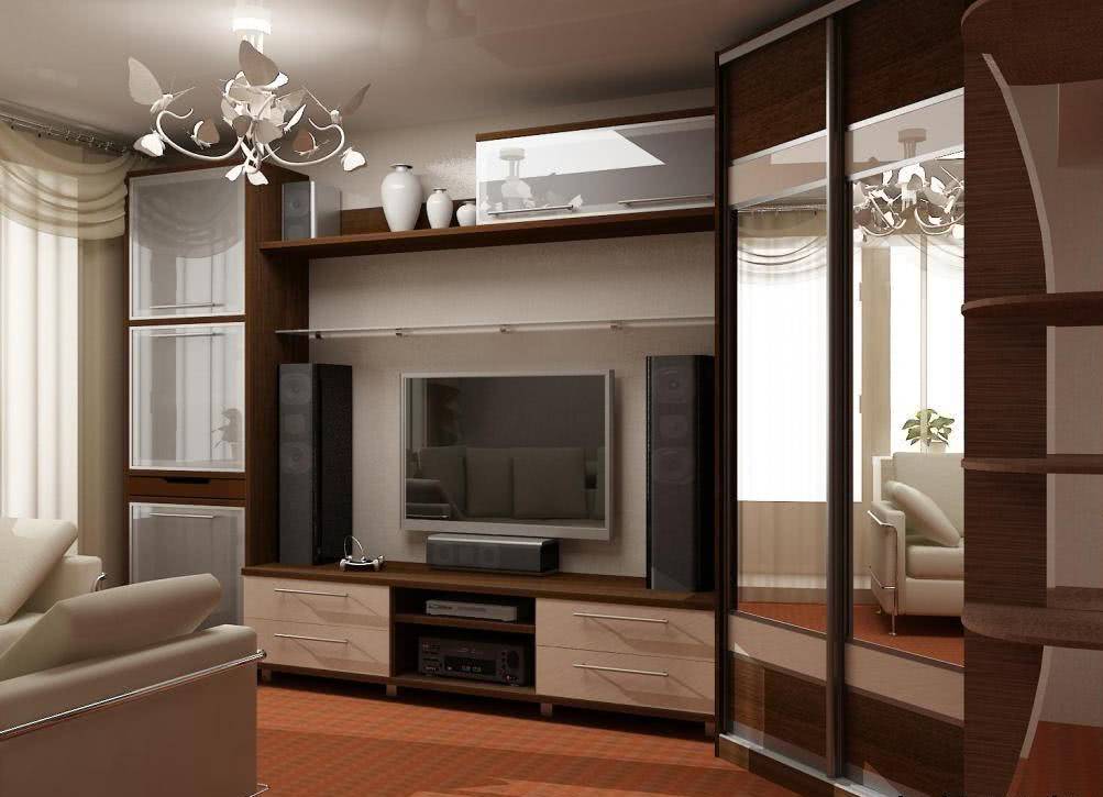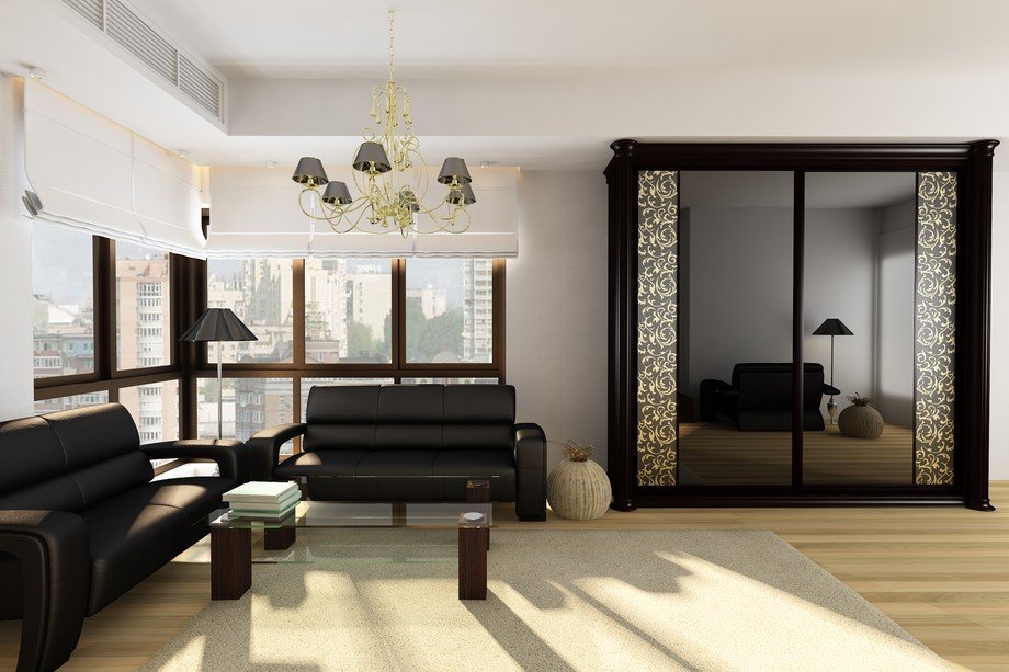 дизайн гостиной со шкафом купе исключительно разнообразен. Декорировать изделия можно в любом стиле, любом цвете и с использованием практически всех существующих материалов: стекла, дерева, ткани, пластика.