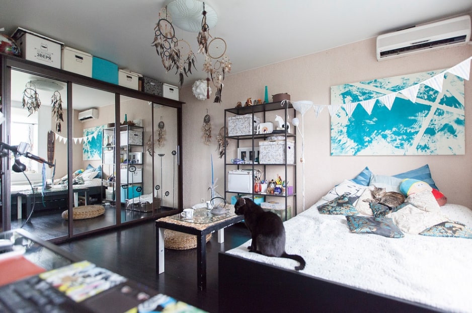 Возможно, вас заинтересует вариант размещения кровати в шкафу, если есть необходимость в дополнительном спальном месте, а площадь квартиры совсем мала. В этом случае матрац с подъемным механизмом надежно и незаметно прячется за дверцей.