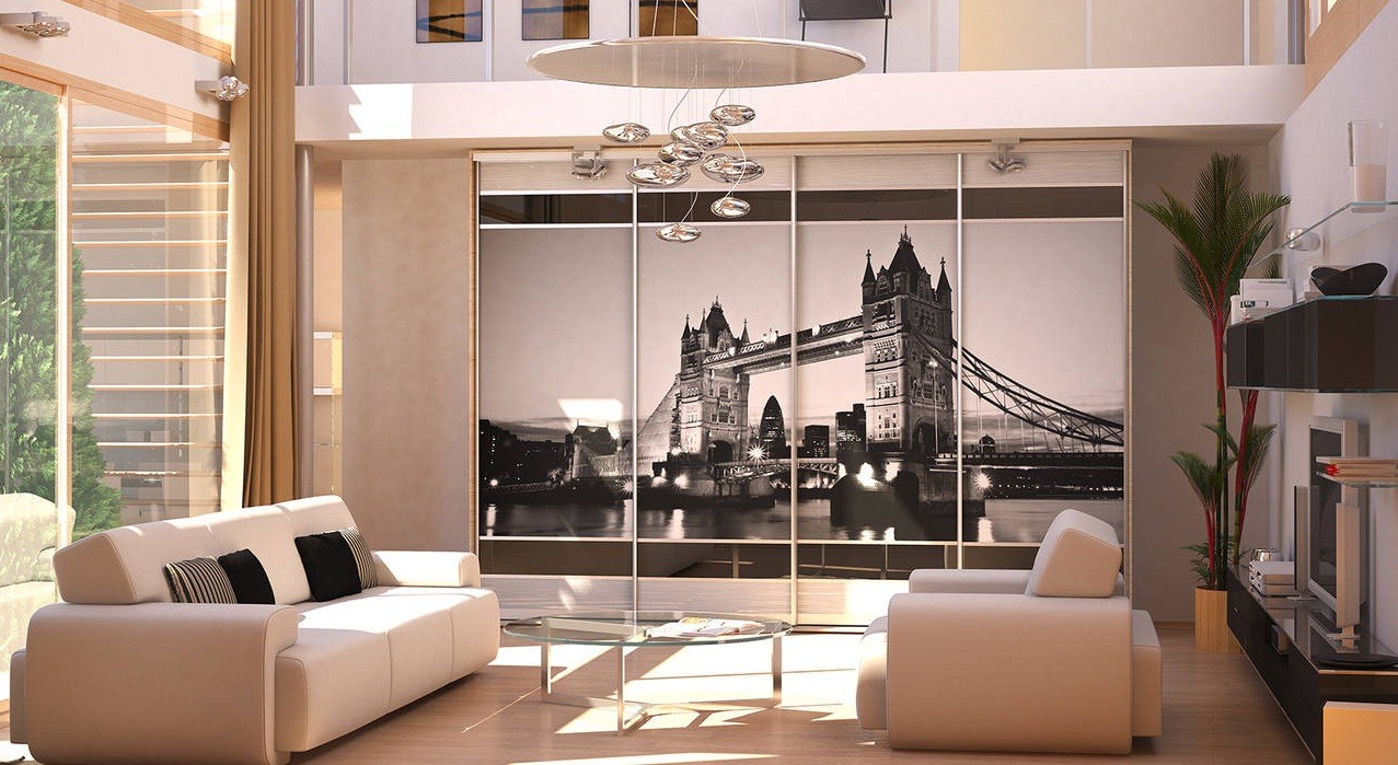 На фото – дизайн оригинальных шкафов купе в гостиную.