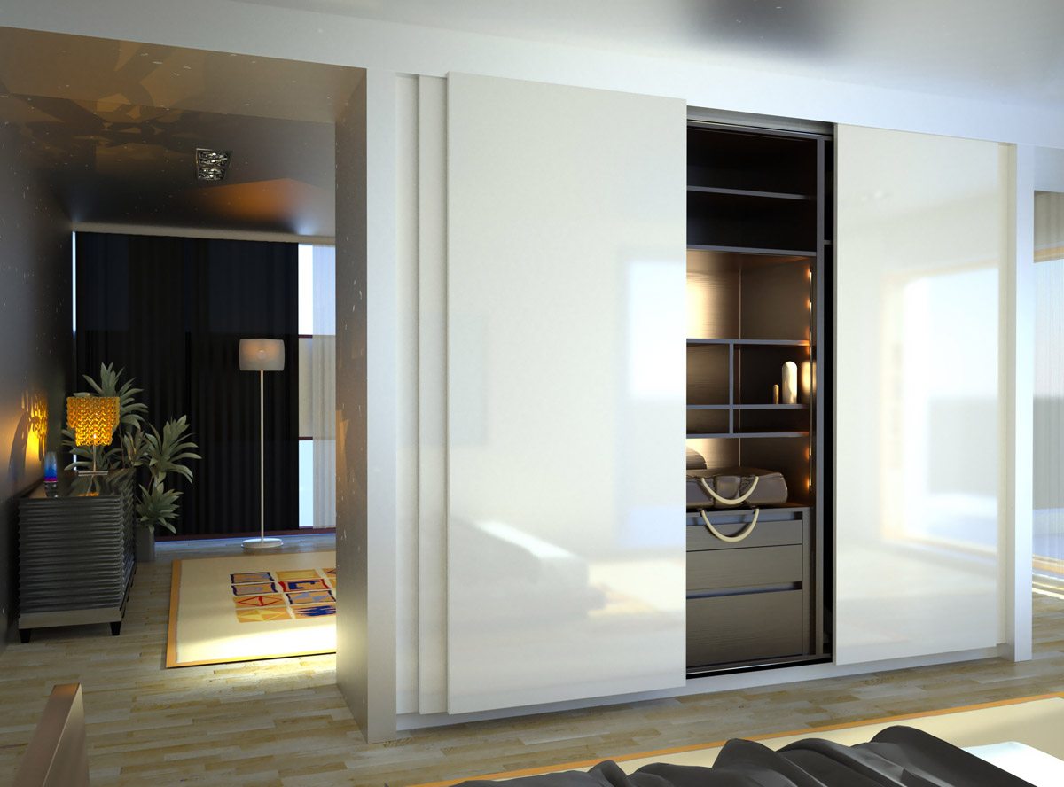 - Кассетные. Так оформляют боковые дверки встроенных шкафов. Створка при сдвижении прячется внутрь специального короба, вмонтированного в стену. Выглядит это красиво, но ценник зашкаливает. Придется обустраивать еще и ниши под боковые створки;