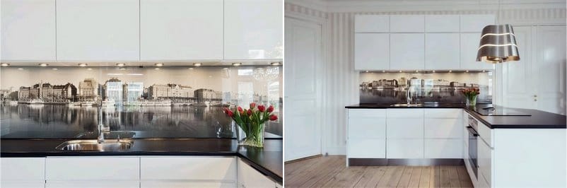Фотопечать — самое простое и популярное решение, которое приходит в голову, если говорить про декорирование стекла. Подобная панель даже имеет специальное название — скинали.