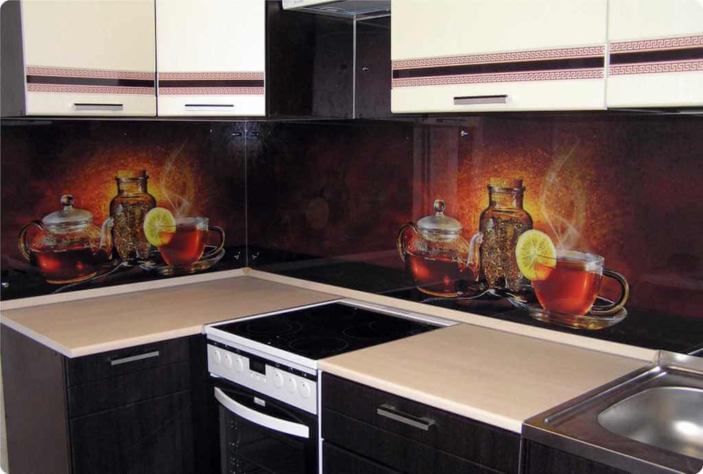 - фартук из триплекса. Многослойный полимерный материал, между его слоями запечатывают изображение, нанесенное на пленку. Прочный, стойкий к большим температурам и к нагрузкам, но дорогой;