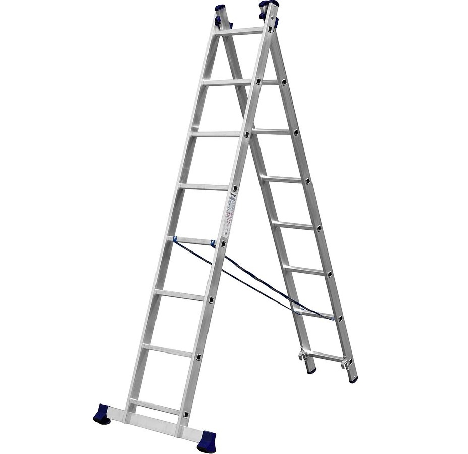 Стремянка со ступенями с двух сторон (двусторонняя). Получается, посредством складывания устройства в две равные части с последующим креплением на шарнире. Устойчивое и прочное сооружение и в специальной опоре не нуждается. Подходит для выполнении хозяйственных работ (оформление фасада, обрезка деревьев, сбор урожая и т.д.).