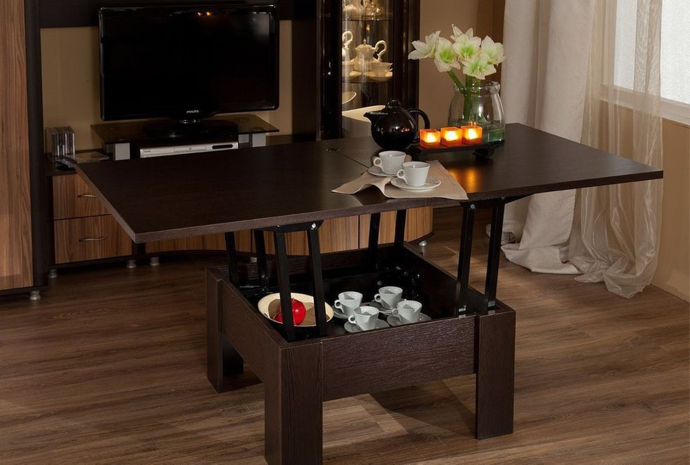 Различают три основных вида столов-трансформеров: журнальный, обеденный и «книжка». Если мебель приобретается для гостиной или в спальню, имеет смысл остановиться исключительно на формате журнального столика. Это позволит, с одной стороны, освободить дополнительное место, а с другой – иметь под рукой готовое решение на случай торжеств или приезда гостей.