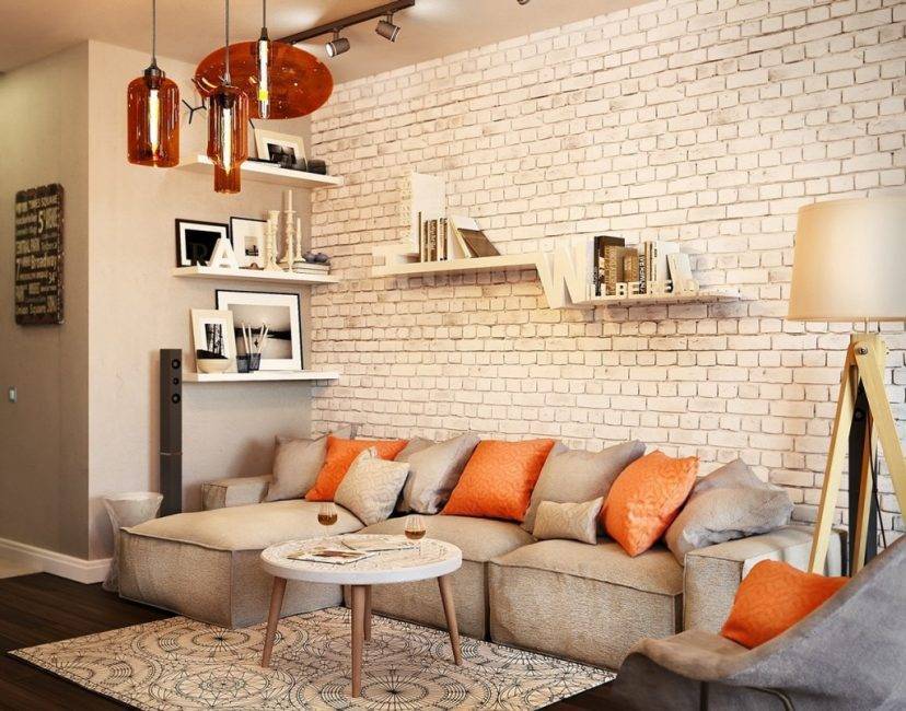 Выполненная от пола до потолка кладка в этом случае не подвергается дополнительному оштукатуриванию или скрытию под листами гипсокартона. Для просторного помещения с высокими потолками одну из стен помещения можно оставить без дополнительного покрытия.