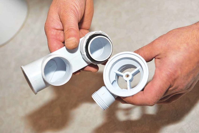 Далее сифон устанавливается на отмеченное на полу место. Выполняется замер трубы, которая будет подключаться к канализационной сети. Если пластиковая труба и патрубок будут располагаться под углом, следует использовать колено, которое фиксируется по направлению канализационного выхода. Для обеспечения герметичности и надежности всех соединений используются уплотнительные резинки.