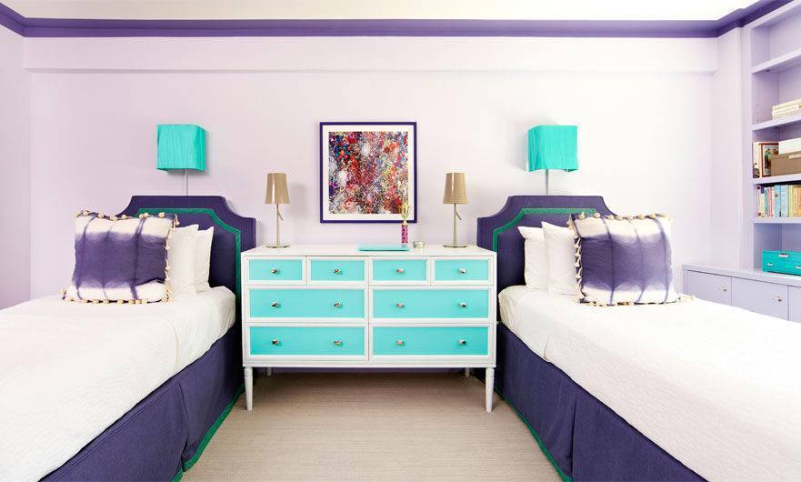 Бирюзовый и фиолетовый в интерьере встречаются часто и отлично выглядят на фоне свежих пастельных стен. Сочетать эти оттенки можно в разном количестве и комбинировать с белым.