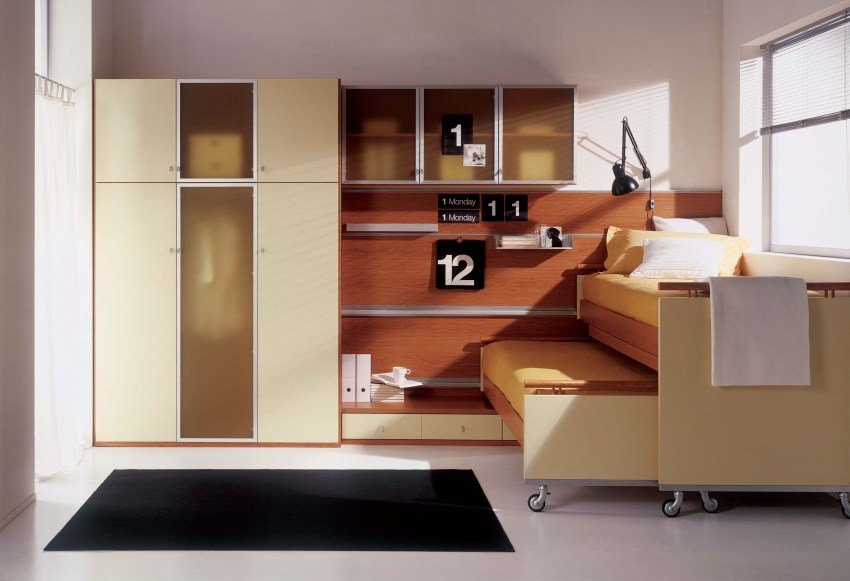 По возможности приобретайте такую мебель, где на втором ярусе кровать, а на первом множество шкафов и полок. Подобные комплексы очень популярны для малогабаритных спален подростков.