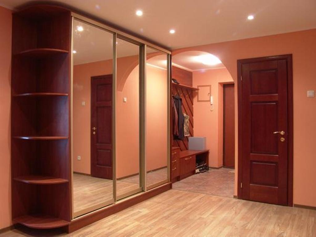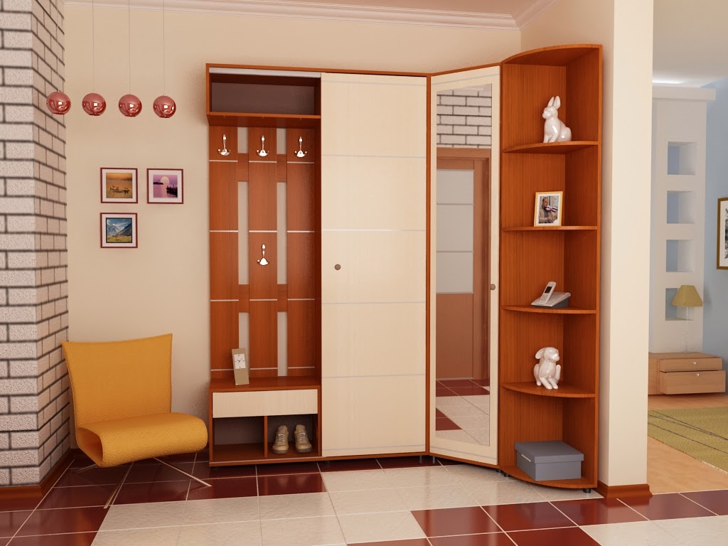 Если прихожие имеют угловую планировку, то в коридор ставятся малогабаритные диванчик, пуф. Удачно, когда тяжеловесные конструкции окрашены в светлые тона. Вешалки лучше использовать открытые, рядом повесить зеркало во весь рост, а под ними – тумба для обуви, где можно присесть и обуться. Так тесная комната будет казаться просторнее.