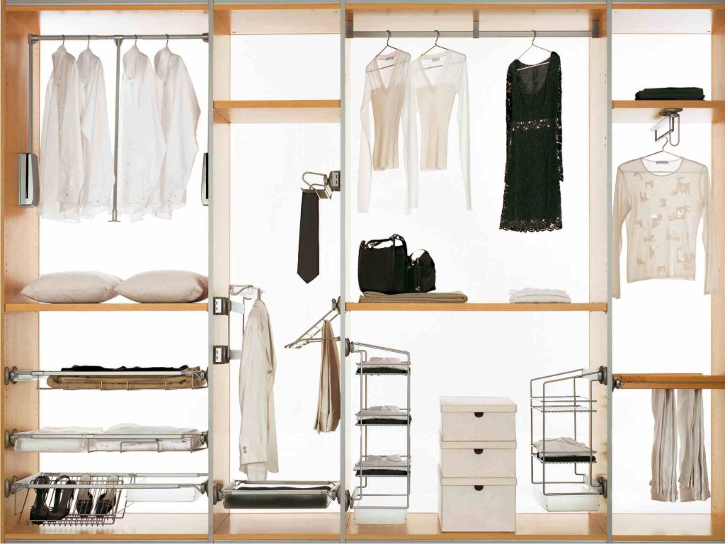 Отличный заменитель массивного неудобного стеллажа – антресоль, станет совсем невидимой, если повесить ее на самый верх и сделать незаметной для стен. Полки, ящики тоже поднимаются высоко либо чуть ниже, закрытые предметы хранения ставятся на пол. Если же в планировке комнаты есть ниша, то можно поместить в нее шкаф-купе с зеркалами на дверцах. Под скамейку для обуви можно использовать пуф.
