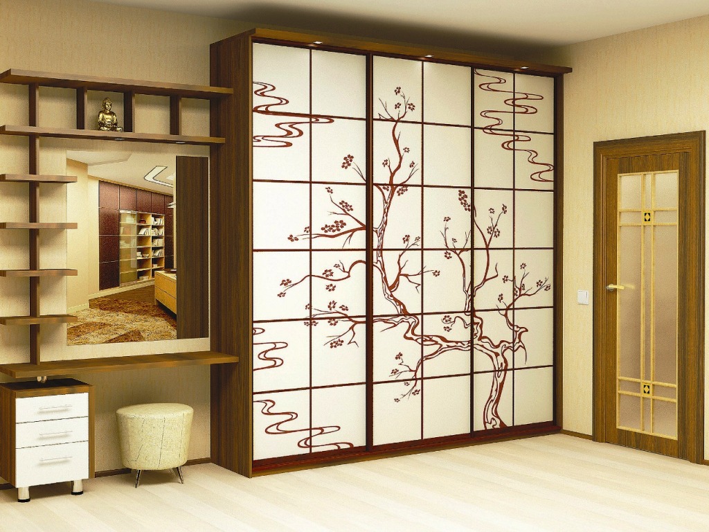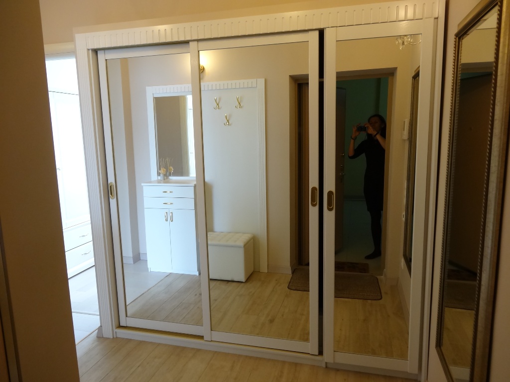 Выбирая большой шкаф, фасад его оформляйте в белом цвете. А что касается его мойки и чистки, то можете не беспокоиться, поскольку современные производители, как правило, оклеивают шкафы купе ПВХ пленкой, благодаря которой очень легко с изделия удалить загрязнения.