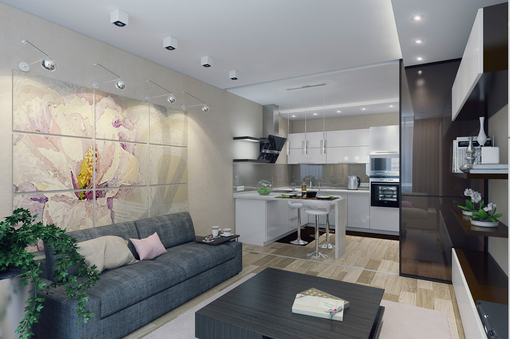 Дизайн небольшой квартиры с комнатой площадью 30 кв.м должен быть дополнен следующими элементами интерьера: