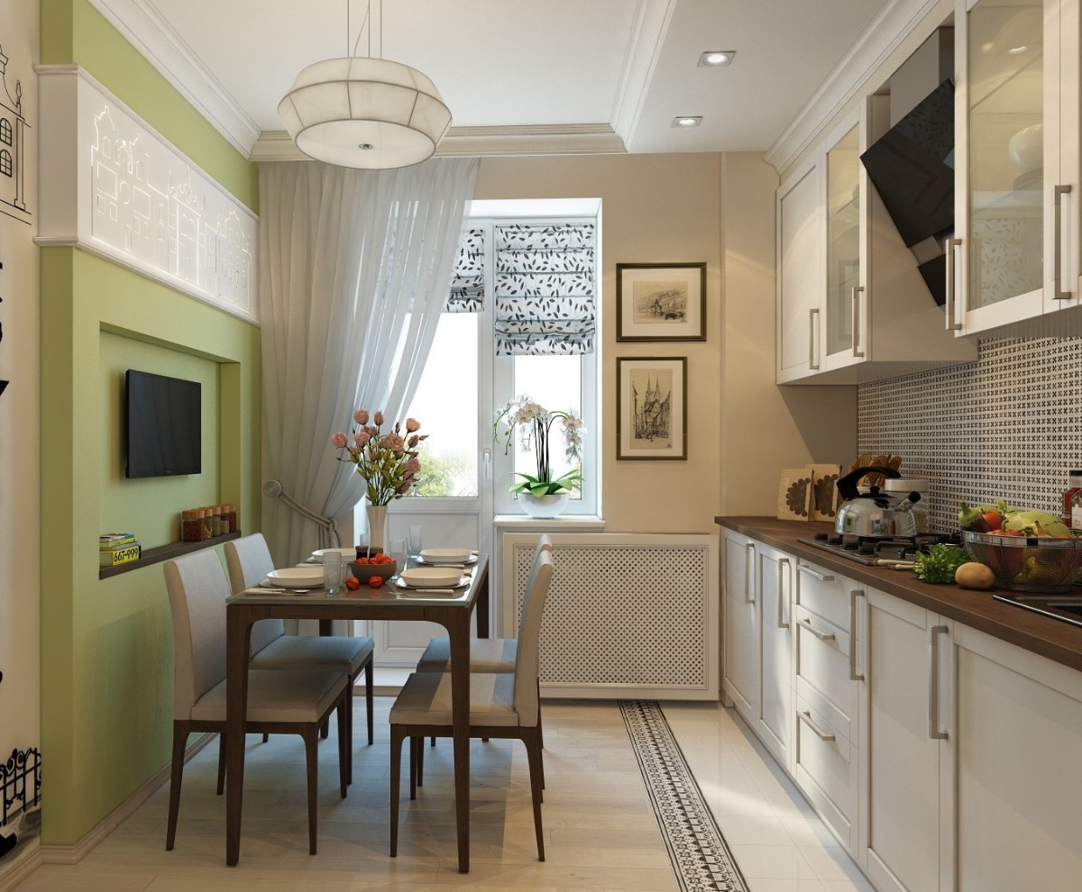 Цветовая гамма стен, потолка, мебели кухни крайне важна. Подбирать ее необходимо с учетом параметров помещения, освещенности, стиля интерьера. Следует помнить, что темные цвета делают кухню визуально меньше, а светлые, наоборот, больше.