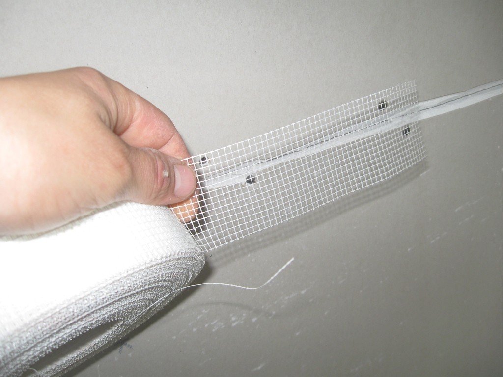 - на места стыков наносим немного раствора и устанавливаем армирующую ленту. Если она самоклеющаяся, тогда можно обойтись без шпаклевки;