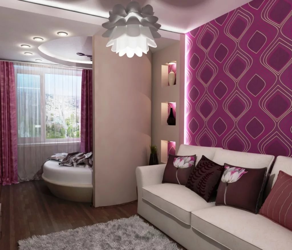 Применяются много способов для разделения в комнате пространства спальни и гостиной: