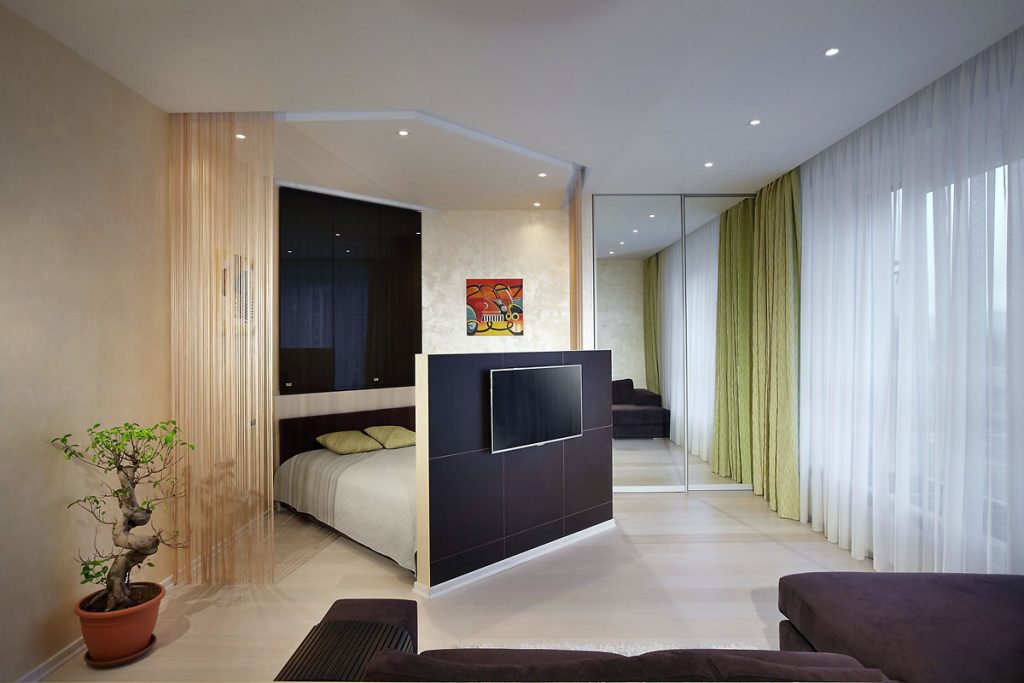 Разделение помещения на функциональные зоны проводят еще до того, как началась перестройка квартиры и куплена мебель. Это помогает правильно подойти к покупке необходимых стройматериалов, аксессуаров и мебели. Прежде всего, мебель не должна занимать много места. Предпочтение отдается мебели-трансформерам. Кровать, которая превращается в письменный стол. Или кровать, которая укладывается в шкаф для белья.