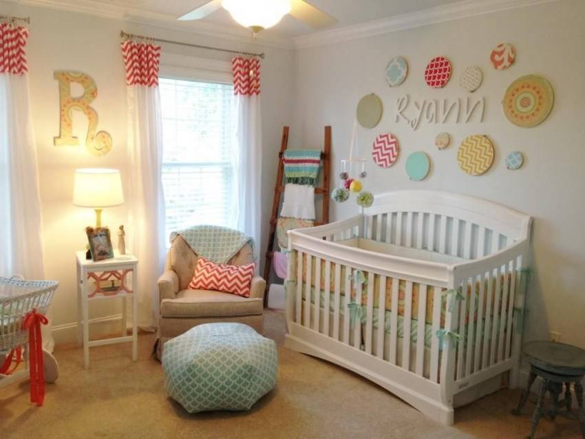 Чаще всего бэби-зону выделяют декором, оформлением стены. Можно задействовать постеры, тканевые гирлянды, декоративные буквы, полочки с игрушками, детские светильники, подвесы и др.