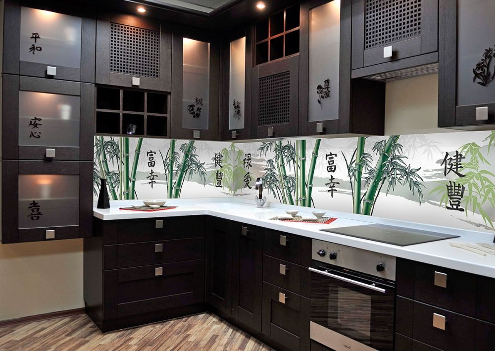 Японская кухня допускает отделку стены под перегородку седзи, выполнить её можно, использовав, накладные панели из ПВХ. Фартук из искусственного декоративного камня, скинали с тематическими рисунками и мозаики из камня, может стать интересным украшением квартиры.