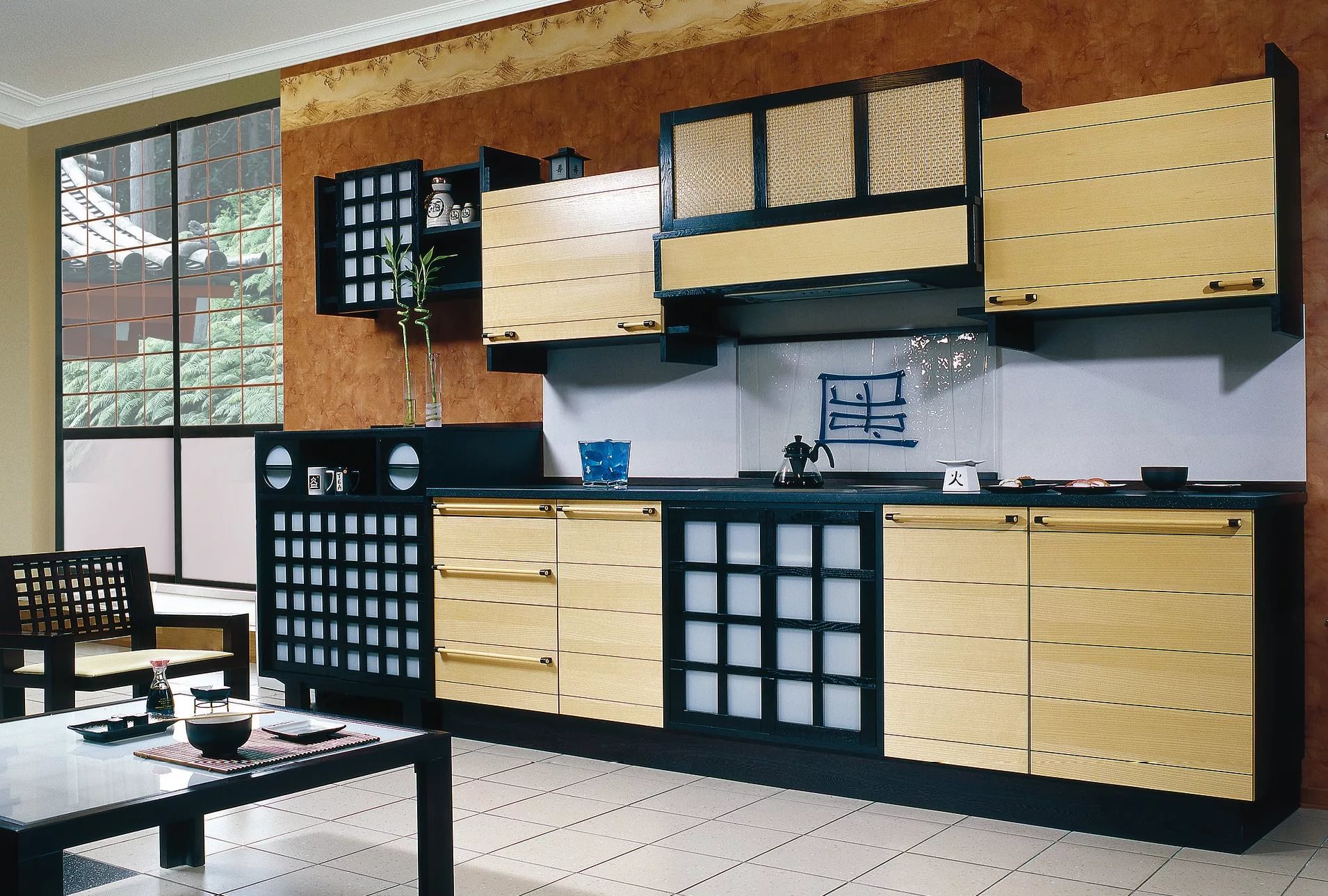 Практичность японского стиля в интерьере позволяет обустроить функциональную и стильную кухню. Сюда отлично подойдет приземистая мебель, натуральный текстиль, ролеты на окнах, циновки на полах. Посуда должна быть вся убрана в шкафчики. Главное не забывать, что японский стиль потребует небольшого количества навесных шкафов, столов, классических стульев. Минимализм поможет сохранить свободное пространство.