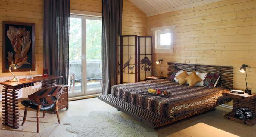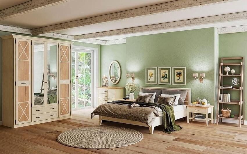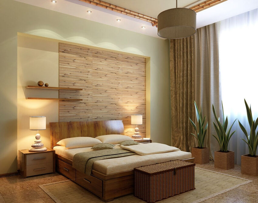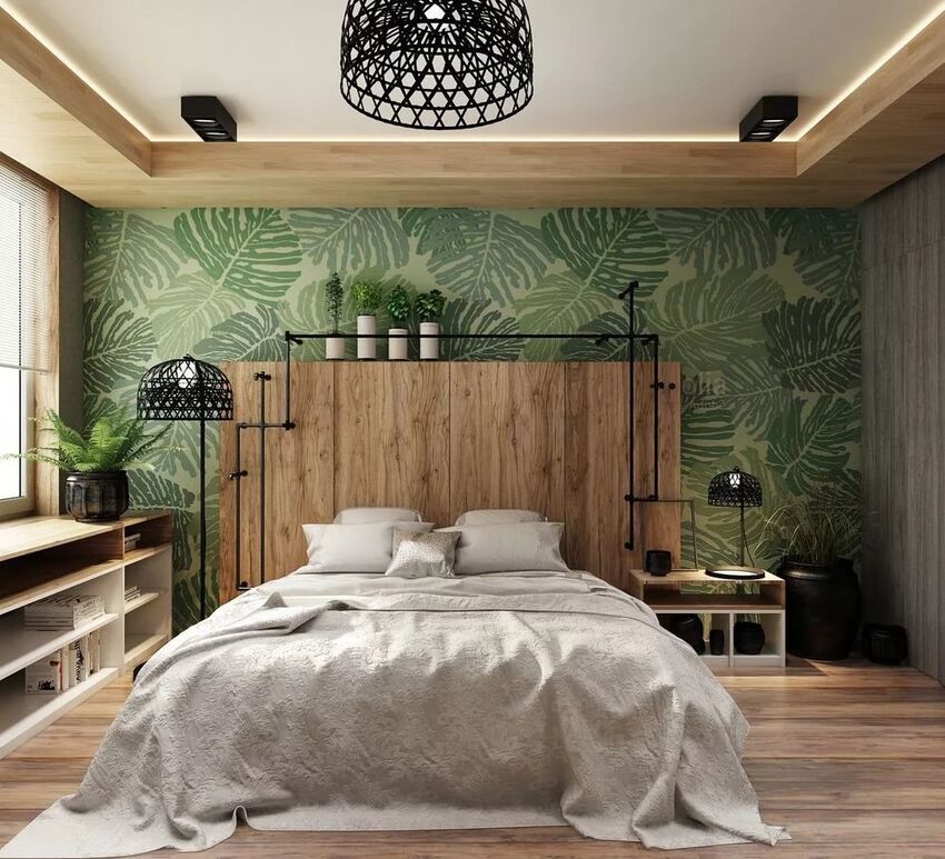 Это современное направление поддерживает различные вариации оформления спальни в древесных тонах. Характерным компаньоном в данном случае выступают светлые оттенки и зеленые тона.