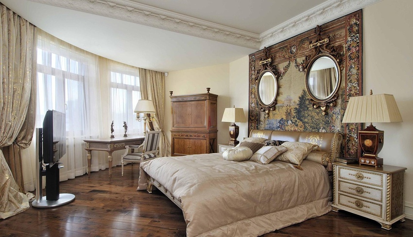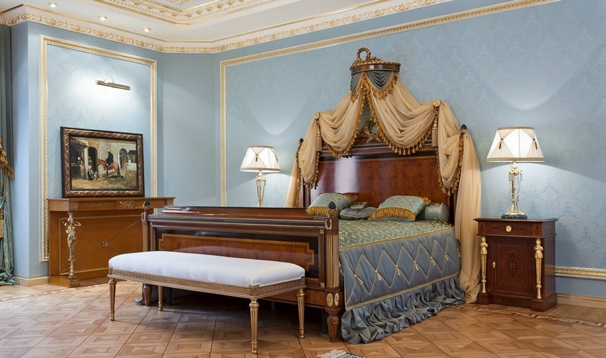 Этот вариант подойдет тем, кто хочет оформить по-королевски роскошную спальню. В данном случае блестящая фурнитура, золота и вензеля будут отлично выглядеть на фоне темно-коричневых оттенков, которые подчеркнут дороговизну и роскошность спальни.