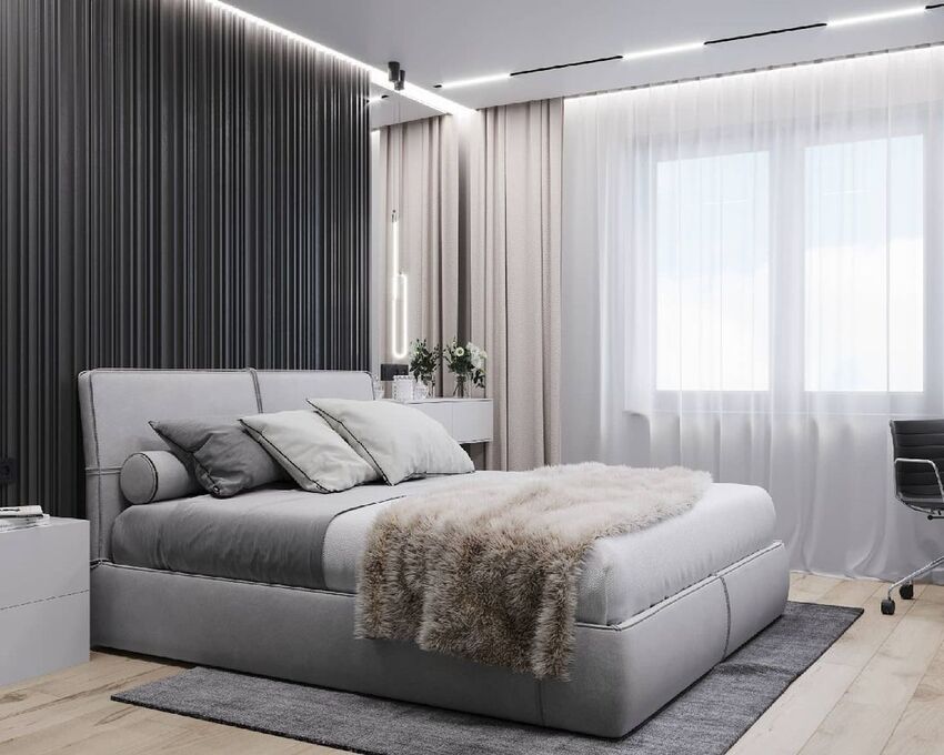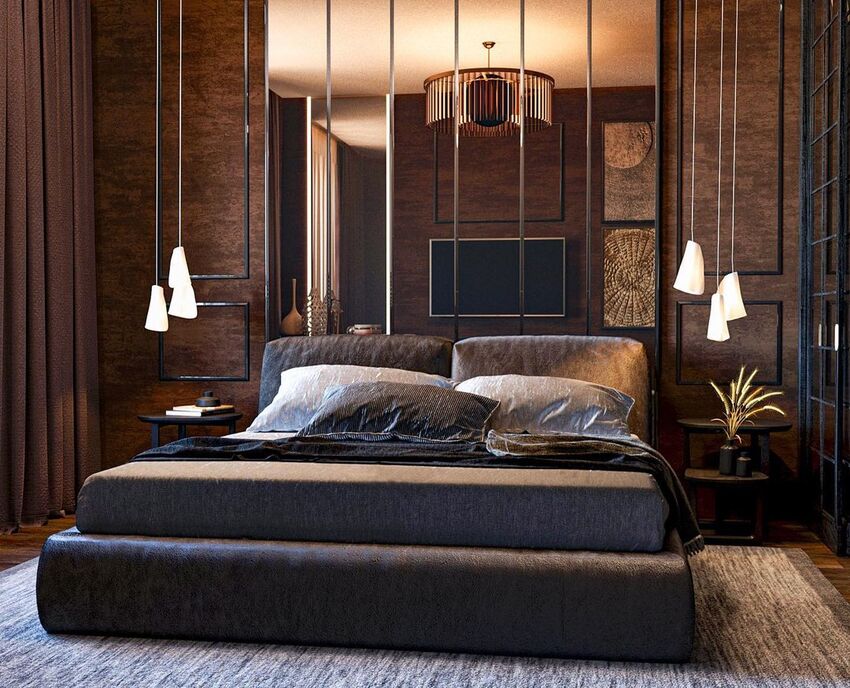 Для данного стиля характерно оформление спальни сочетанием коричневого с различными оттенками серого. В результате, интерьер становится современным, утонченным и одновременно роскошным.
