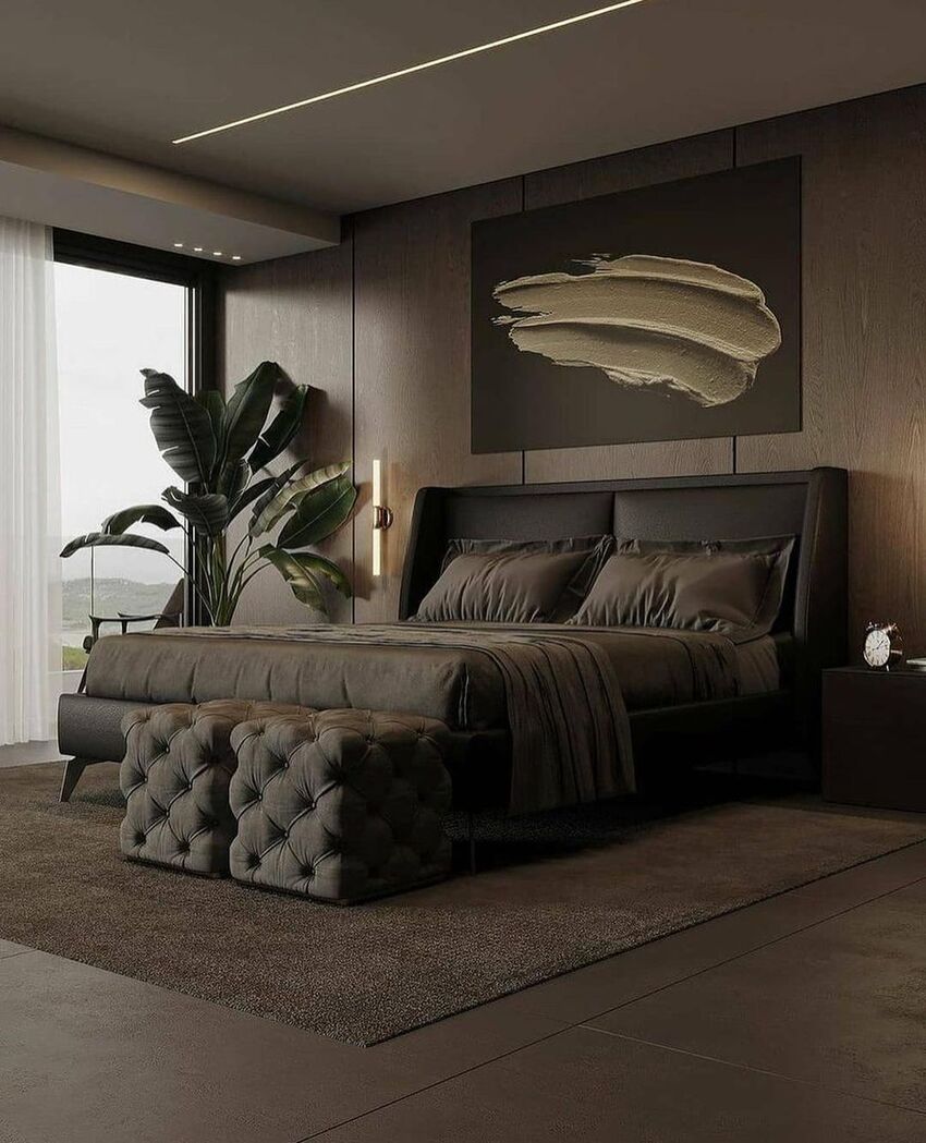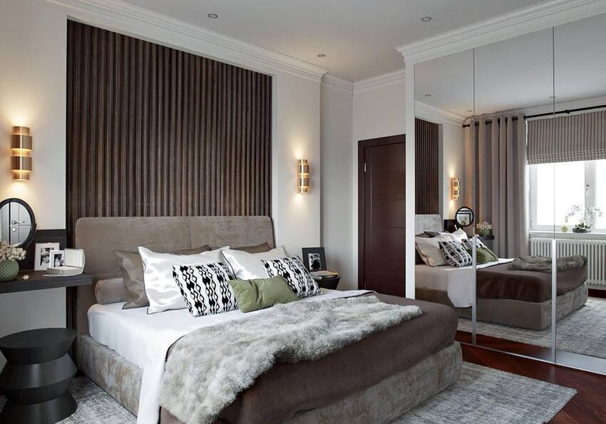 Коричневый сделает спальню строгой и элегантной, а его глубину можно будет подчеркнуть при использовании темных оттенков текстиля и штор.