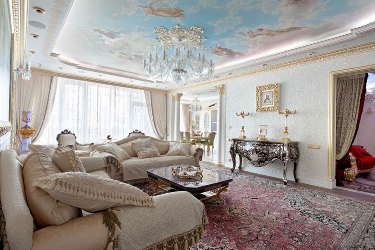 Самый популярны вариант – белый потолок расписанный золотом. В качестве украшений на потолке используют гипсовые фигурные карнизы.