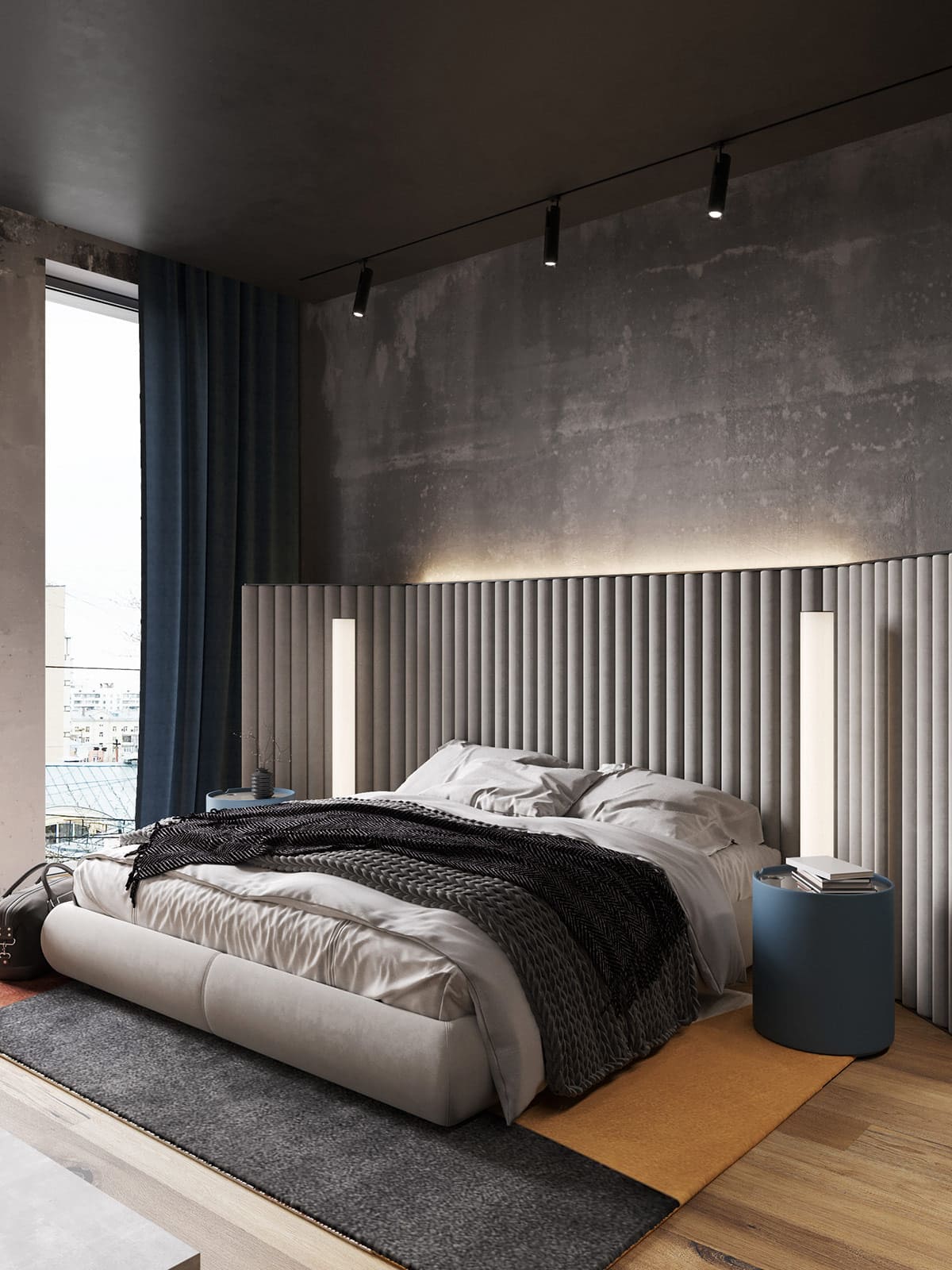 Интерьер, стилизованный под софт-лофт в спальне-гостиной, означает также больше тканей. Вы можете украсить кровать подушками с геометрическими узорами, например, черно-белым пледом, и разместить на полу пушистый коврик. Бетонная стена будет выглядеть более дружелюбно, если вы повесите на нее разноцветные плакаты и картины. Помните золотое правило сдержанности и не добавляйте слишком много дополнений в спальню, так как это может создать ощущение случайности и хаоса.