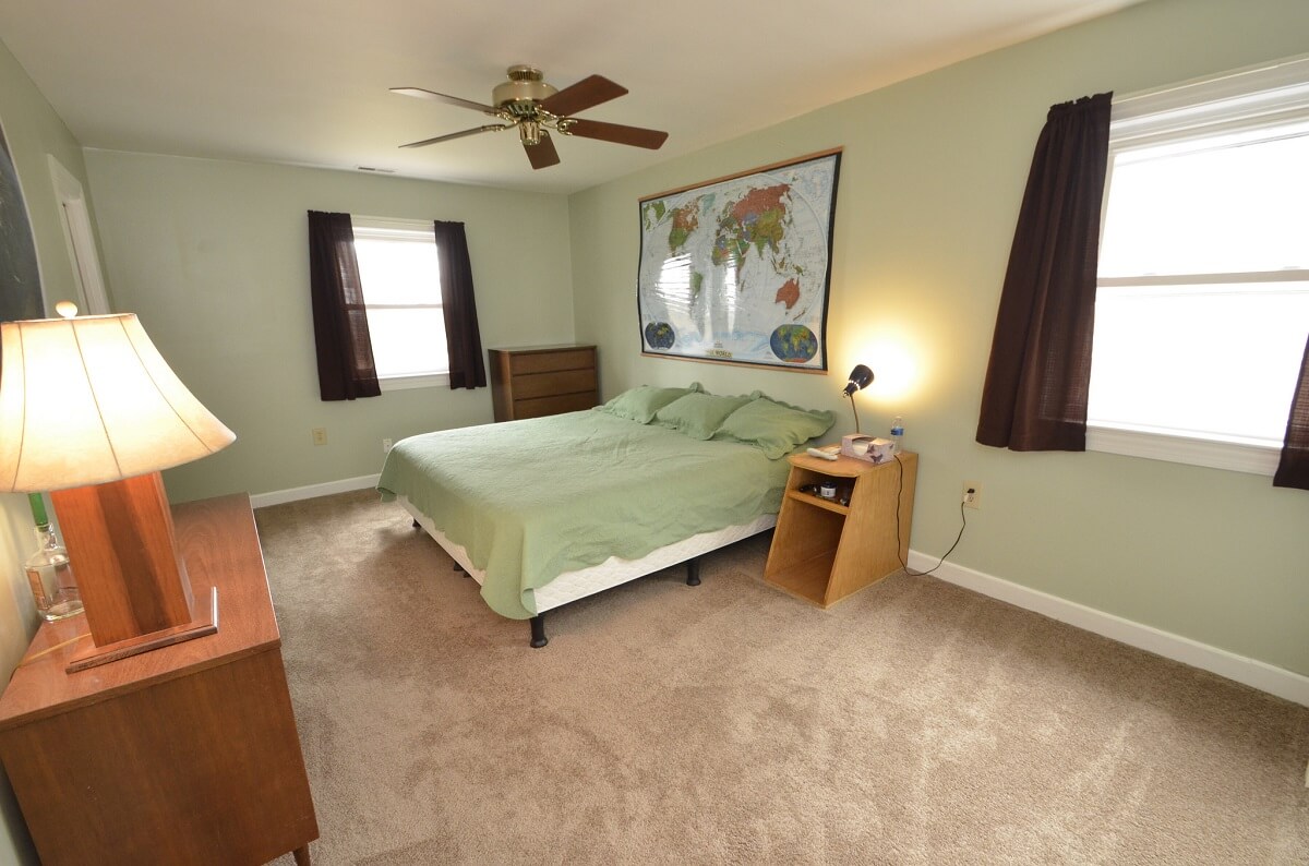На фоне светло-бежевых стен найдет свое место темно-коричневая кровать с белым постельным бельем и две темные прикроватные тумбочки. Напротив них можно расположить рабочую зону со столом и стулом в темном цвете. Разбавить контраст мебели и отделки следует с помощью ковра, сочетающего в себе нежно-коричневый и темно-коричневый цвет, светлых занавесок и картин над кроватью со светлыми рамками.