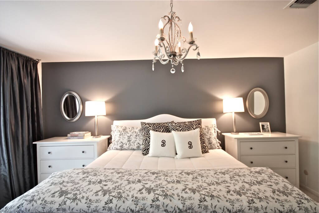 Не обязательно подбирать предметы около кровати в одной цветовой гамме из одного комплекта, дополняйте пространство прикроватными тумбами, шкафами серого, древесного, черного цветов. Добавляйте зеркальные поверхности, дополняйте белую мебель светлыми предметами и визуально расширьте пространство.