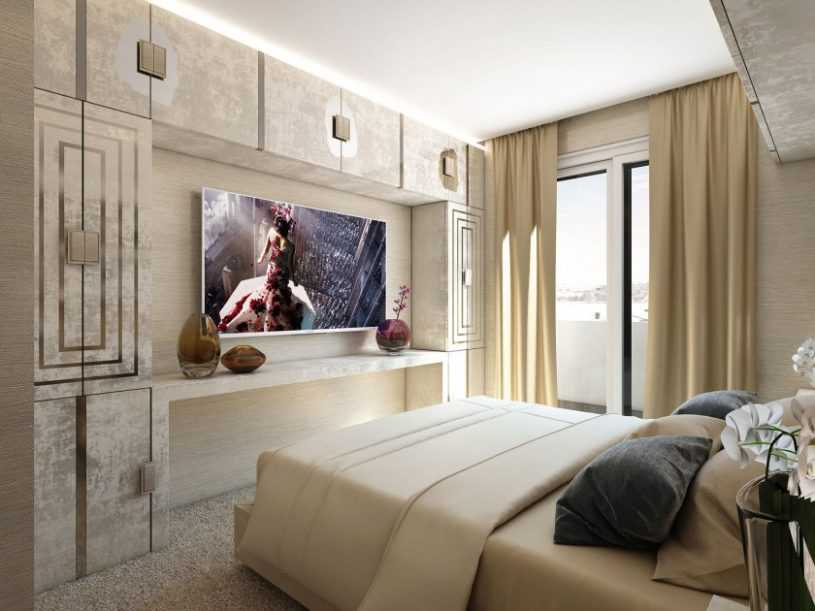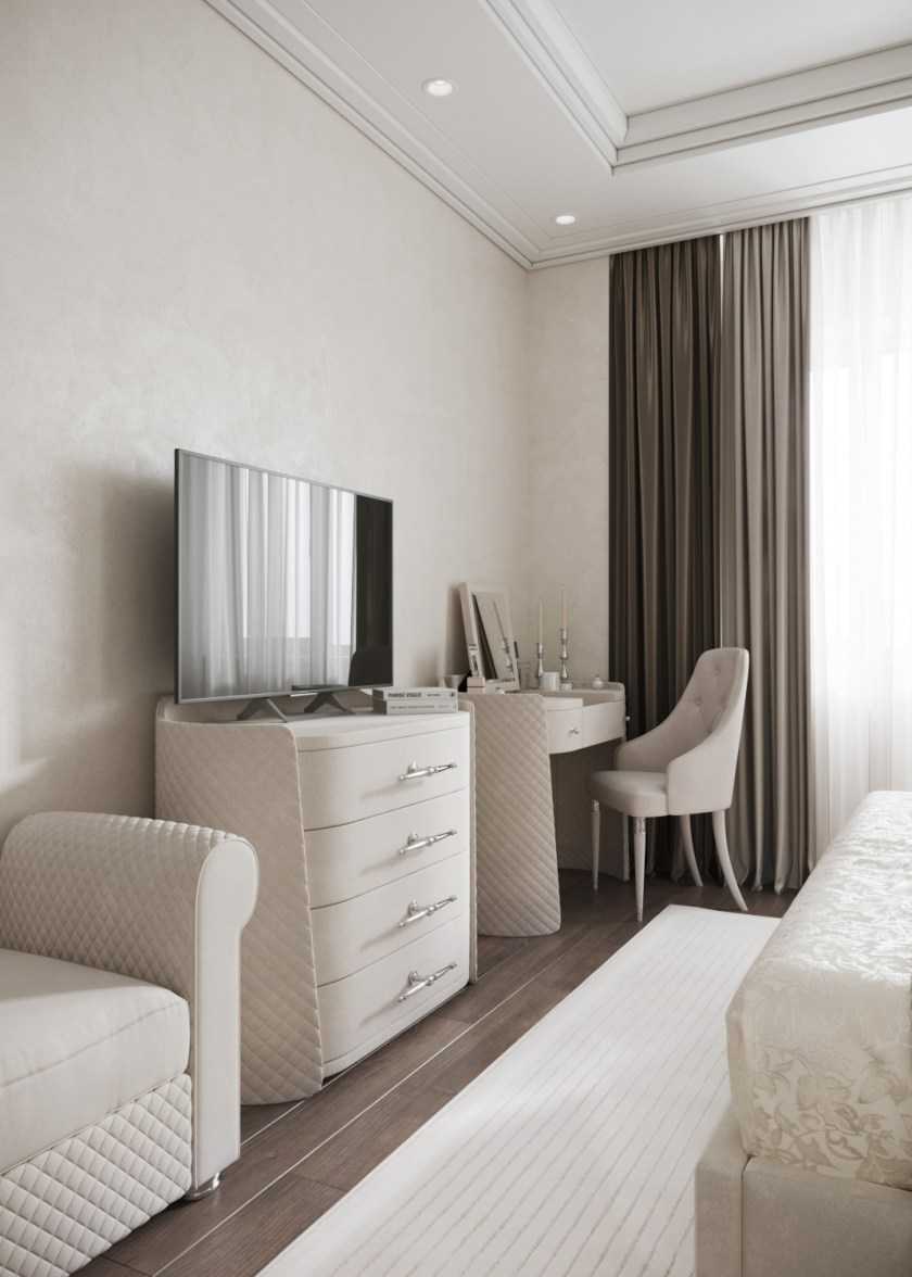 Концепция дизайна выбирается в соответствии со вкусами и предпочтениями жильцов. Также, помимо своего основного назначения, в спальне может располагаться рабочее место, кровать для малютки, телевизор.