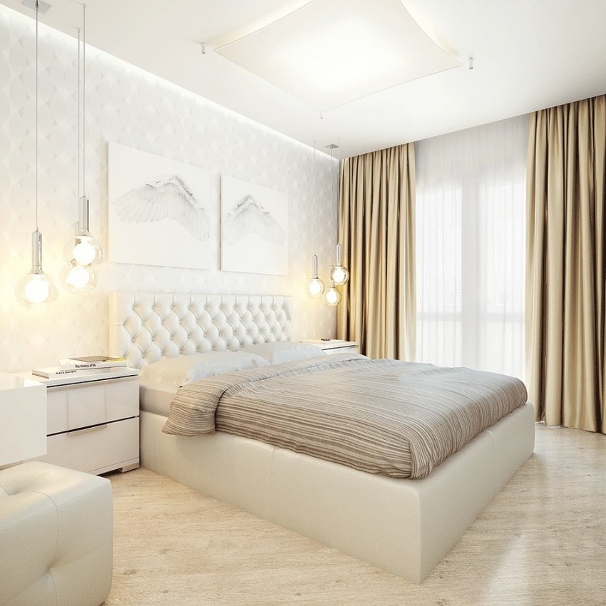 Белый свет будет визуально расширять комнату. Поэтому его можно применять в дизайне и оформлении спальни в небольшом помещении для коррекции пространства.
