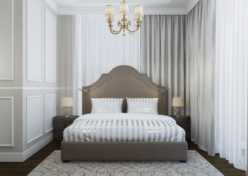 Для классики характерно наличие координационного центра, вокруг которого строится вся композиция. В спальне таким центром служит кровать.