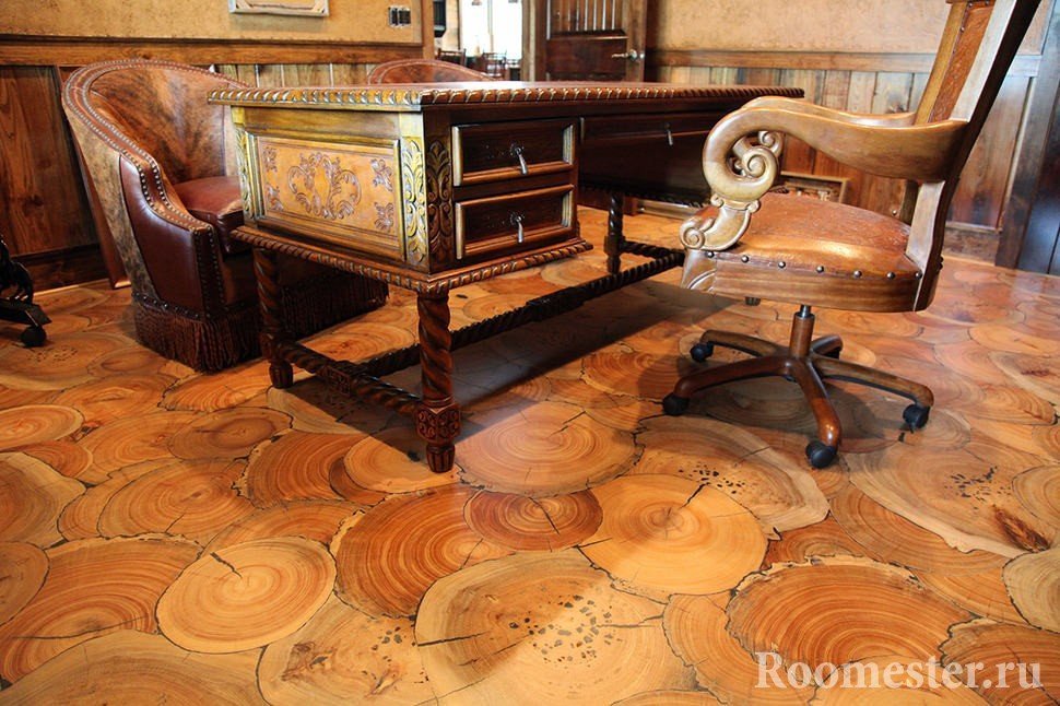 Деревянные материалы нередко используют для покрытия полов. Круглые пластины бревен также широко применяют для этих работ. В результате поверхность выходит прочной, экологически безопасной, эстетически привлекательной и необычной.