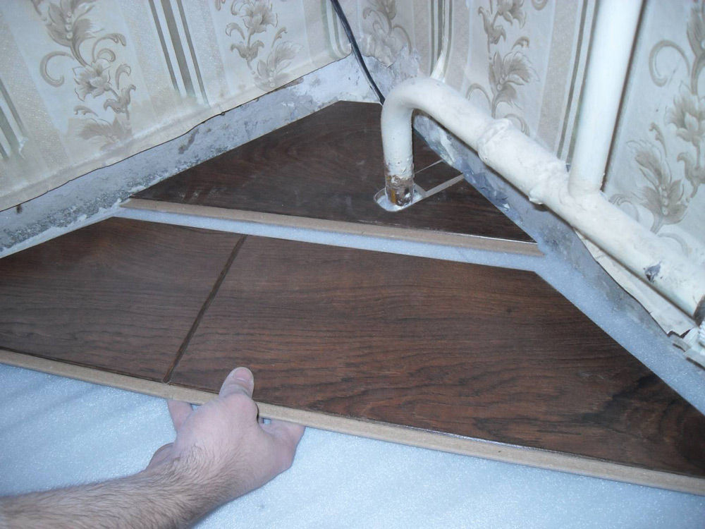 Если рядом с углом, где начинается монтаж, проходит отопительная труба, правильно класть ламинат именно отсюда, сразу обрезав на шве две ламели для отверстия, идущего на трубу.