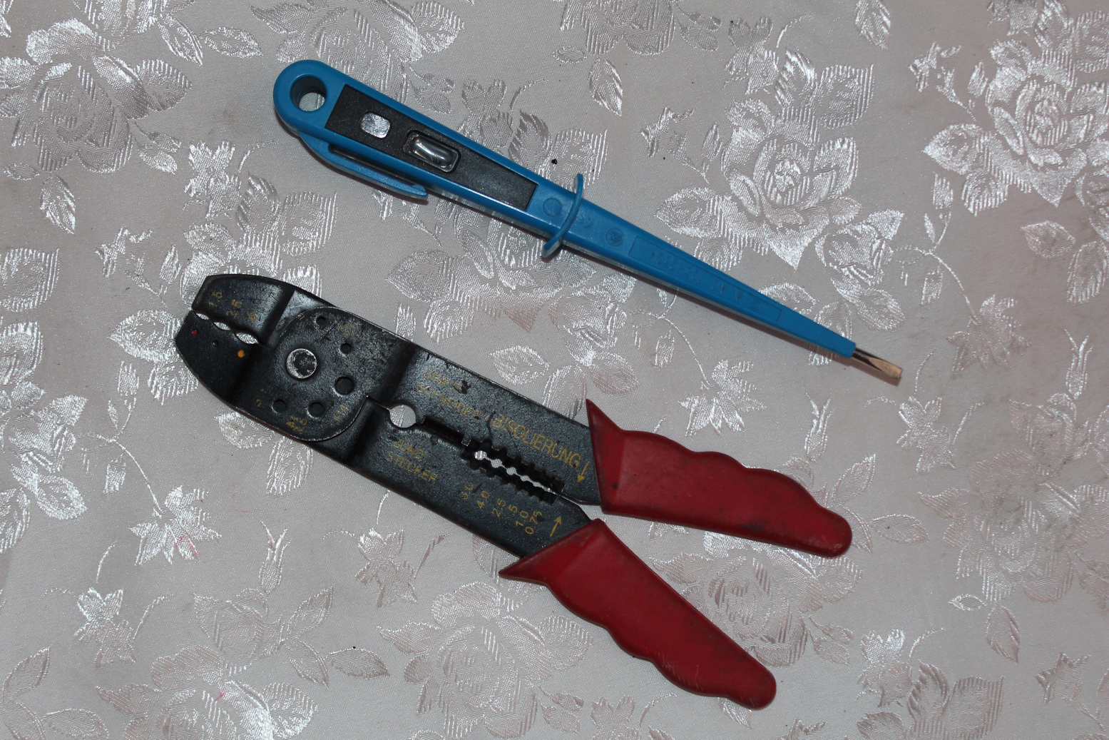 Так как я по первому образованию помощник машиниста тепловоза, то хорошо знаю электричество и эл. сети. Для работы с ними я использую индикаторную отвертку, плоскогубцы, спец инструмент для зачистки проводов и конечно же тестер.