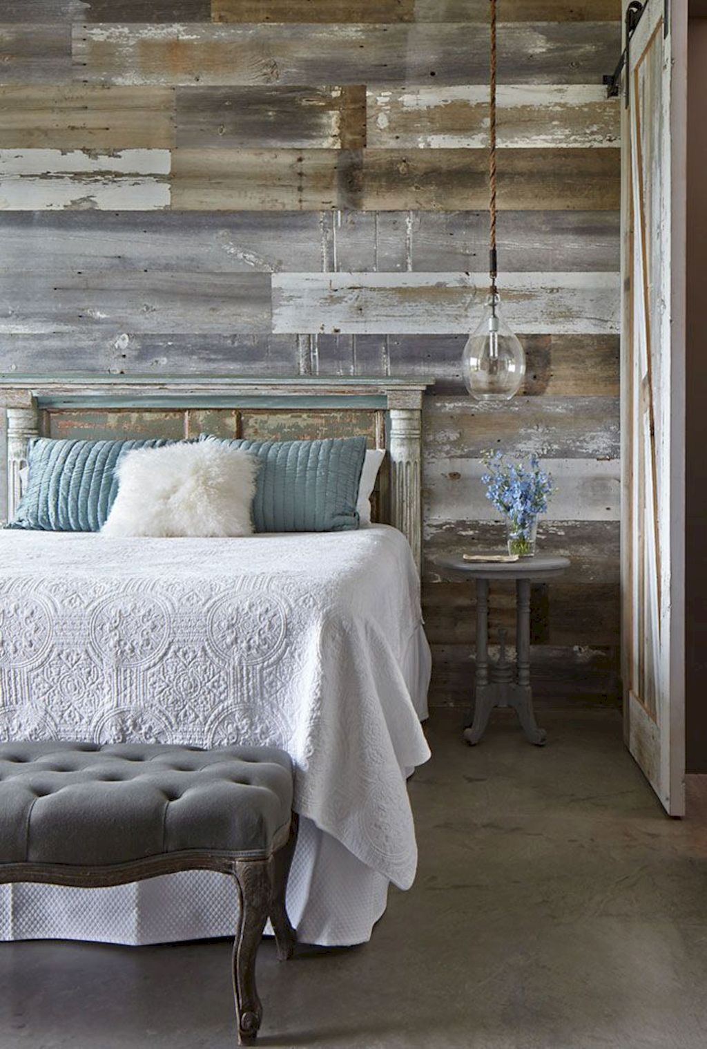Закрытая панелями из древесины или вагонкой стена позади изголовья кровати обеспечит отличную звуко- и теплоизоляцию.