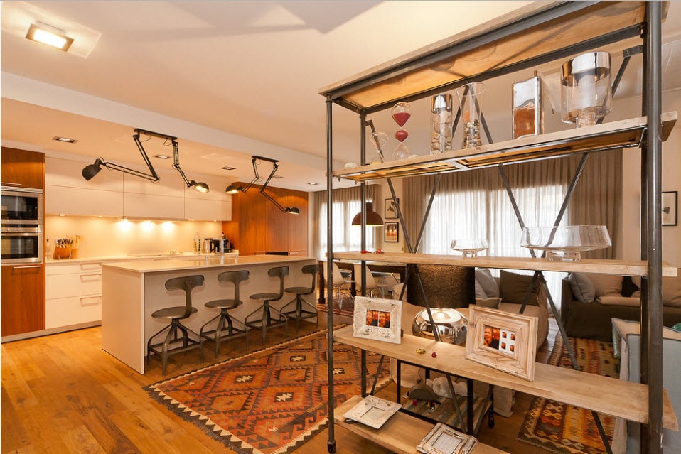 На фото модульный стеллаж-перегородка от пола до потолка, который разделяет гостиную зону от кухонной.