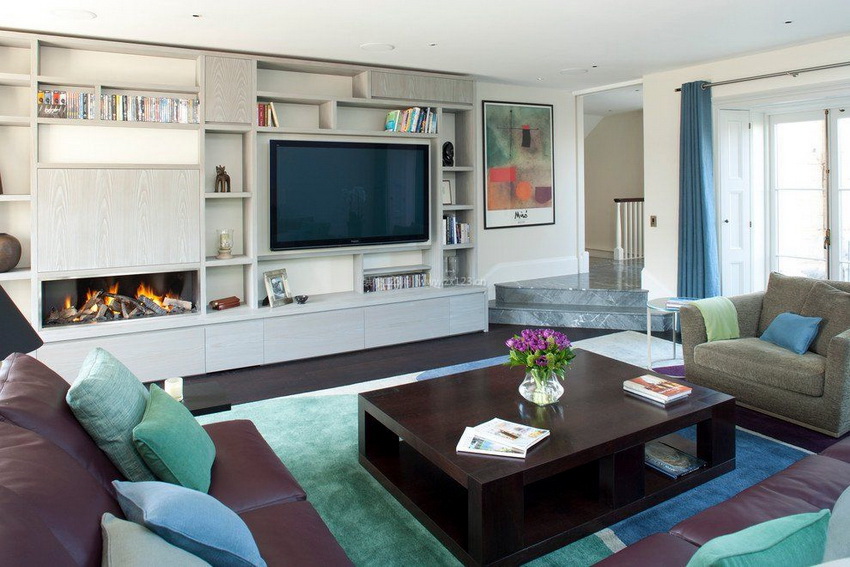 Однако по отношению к нему высота и ширина пеналов и шкафов с обеих сторон может быть как одинаковой, так разной. Особенно эффектно такое решение смотрится на мини-гостиных.